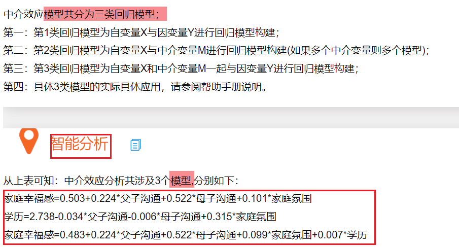 中介作用分析可以根据SPSSAU智能分析写公式,如图
