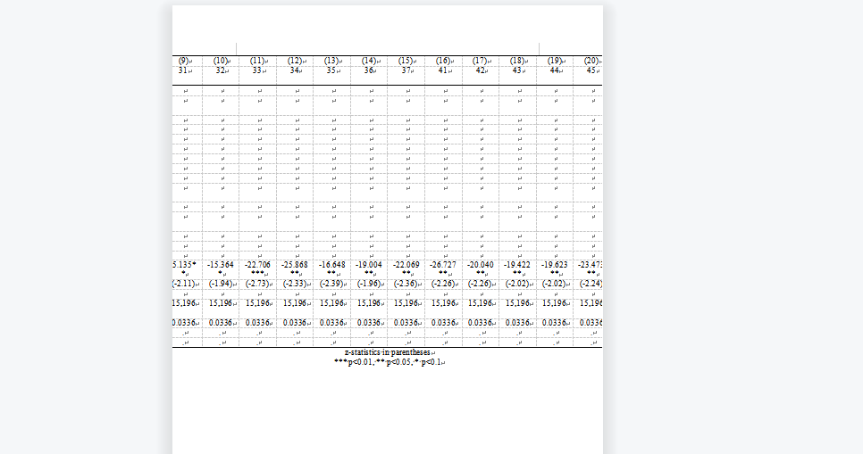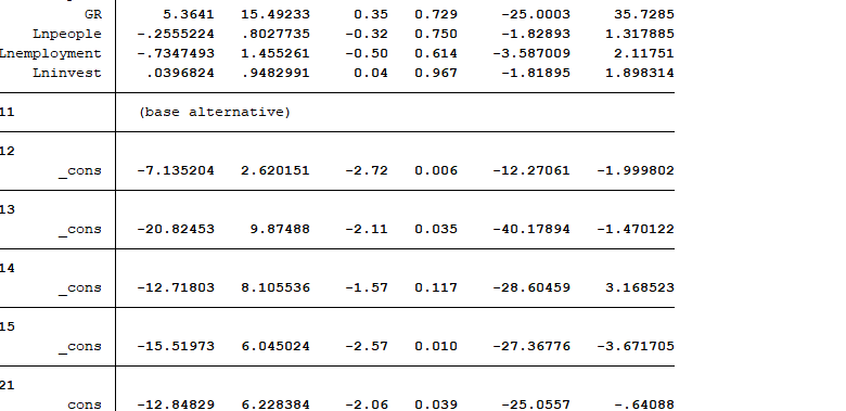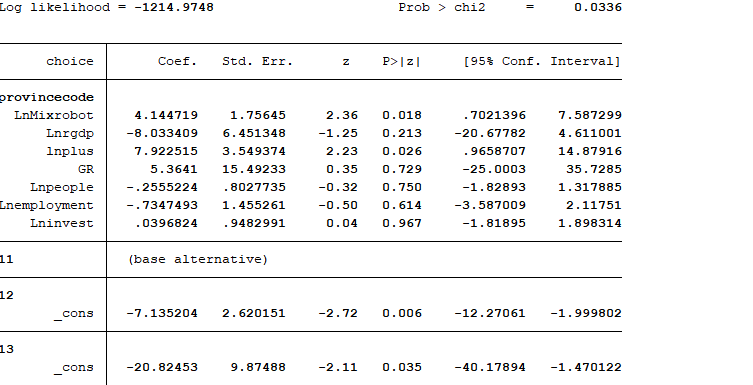 有没有大佬帮忙看下stata的问题呀,本人搞了一晚上都没搞好,也在网上查了好久,实在没办法向大家求救。 ①就是我用的是混合logit回归,命令是 asclogit choice LnMixrobot Lnrgdp lnplus GR Lnpeople Lnemployment Lninvest , case( ID ) alternatives( provincecode),最后回归结果如图一二所示,但是在输出的word上时就会出现图三的情况,怎么才能让它只输出图四内容呢? ②混合logit可以加固定效应吗?比如时间、个体固定效应。这是老师让改的论文,原文中无固定效应和机制分析,中介机制我可以做了但是固定效应要做的话整个论文的回归结果,异质性分析什么的都要加固定效应啊