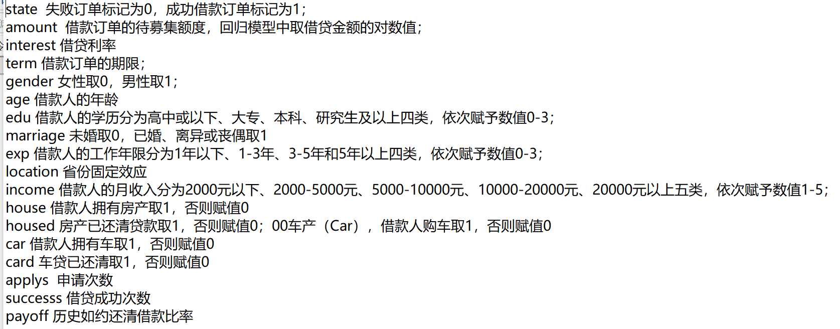 数据指标:订单是否成功、借款订单的待募集额度、借贷利率、借款订单的期限、性别、借款人的年龄、借款人的学历、婚姻状况、借款人的工作年限、省份固定效应、借款人的月收入、借款人拥有房产、房产已还清贷、借款人拥有车、车贷已还清、申请次数、借贷成功次数、历史如约还清借款比率等