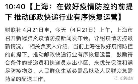 政策上,近日国家发布《加快建设全国统一大市场的意见》,提出建设现代流通网络,大力发展第三方物流。今天上午上海发布消息,恢复邮政快递运营。