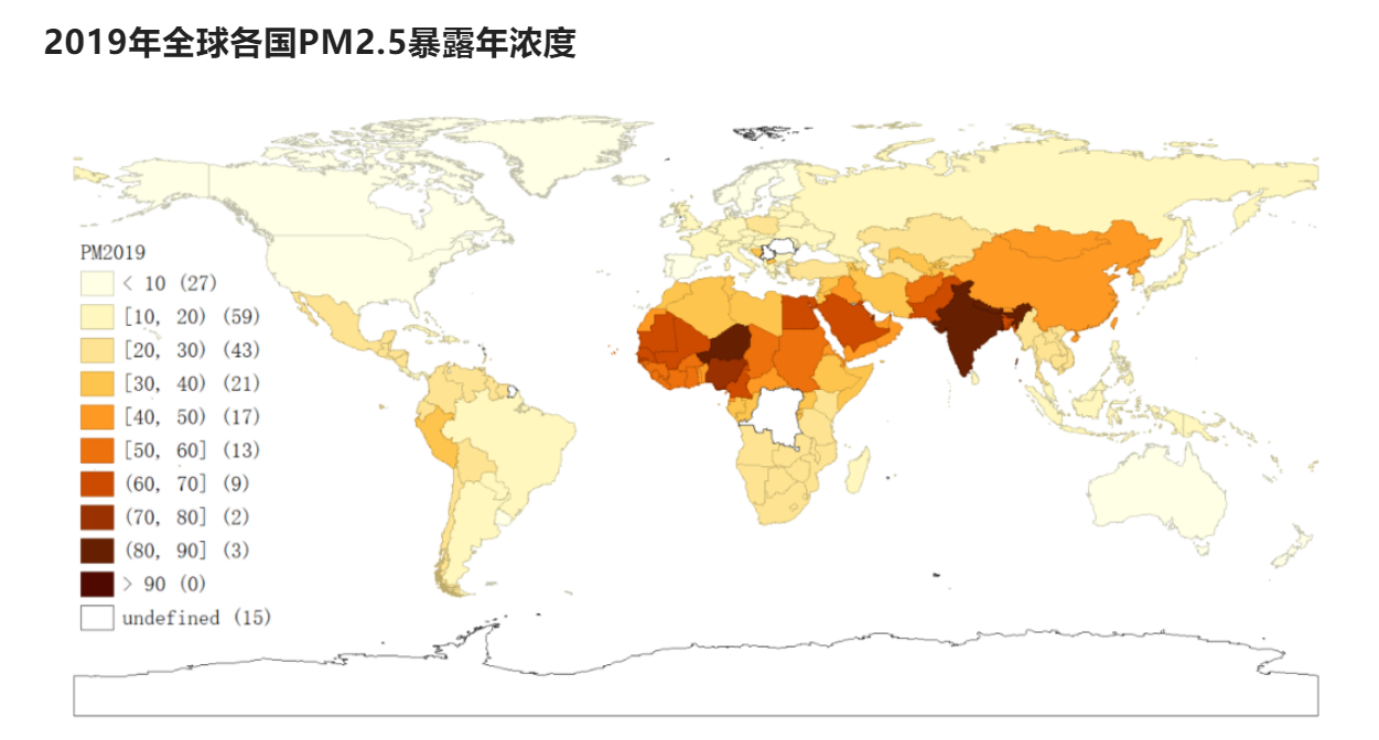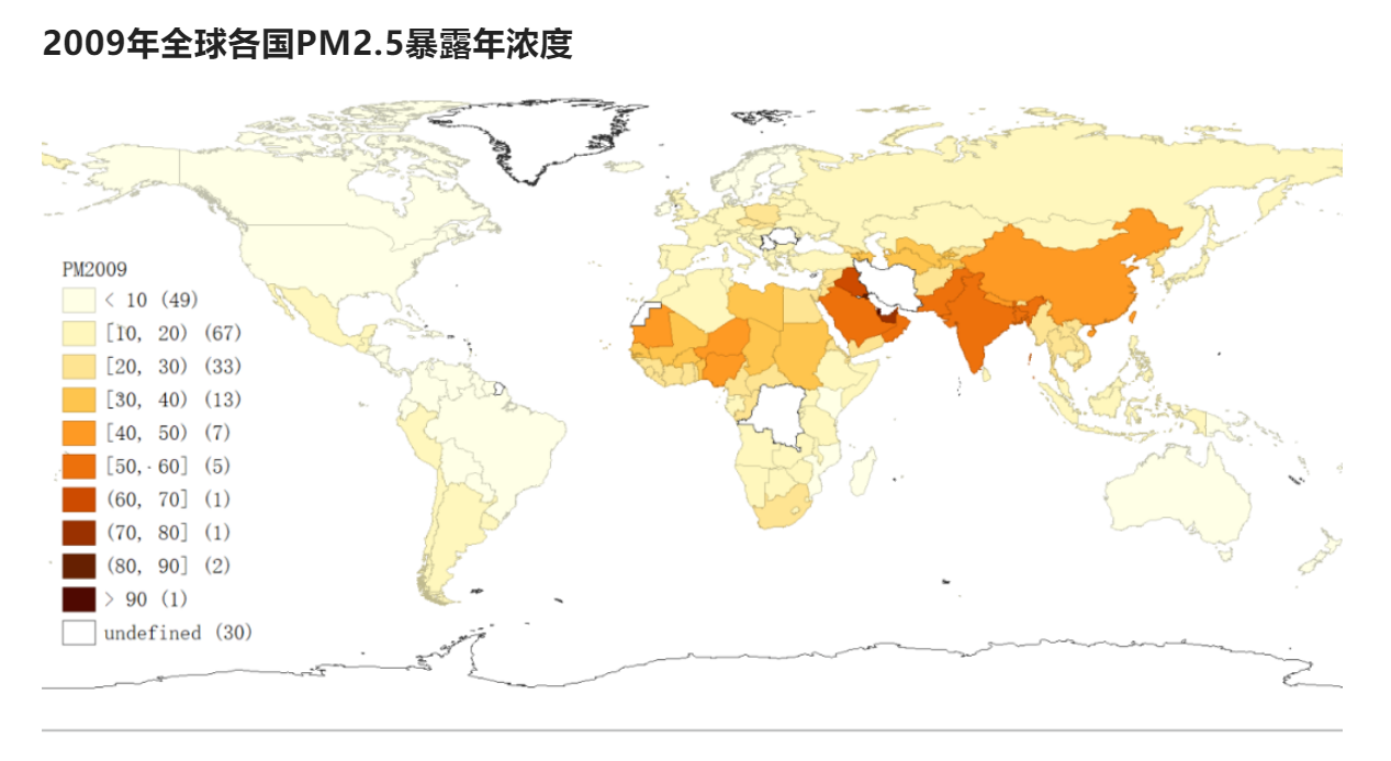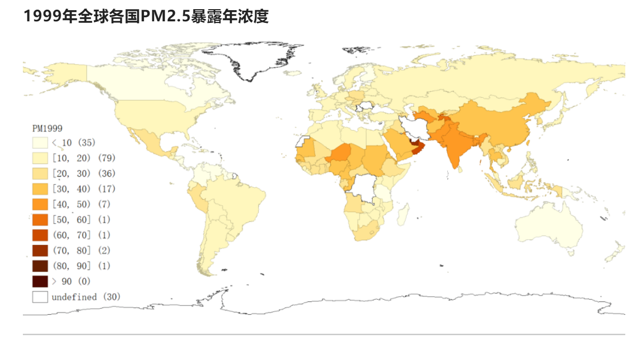 从这20年PM2.5浓度的变化中,大家会发现虽然我国天气状况越来越好,但PM2.5浓度的颜色并没有发生什么变化,PM2.5的浓度也没有明显的改善,相比于欧美国家,我们的PM2.5浓度还处于较高的水平。