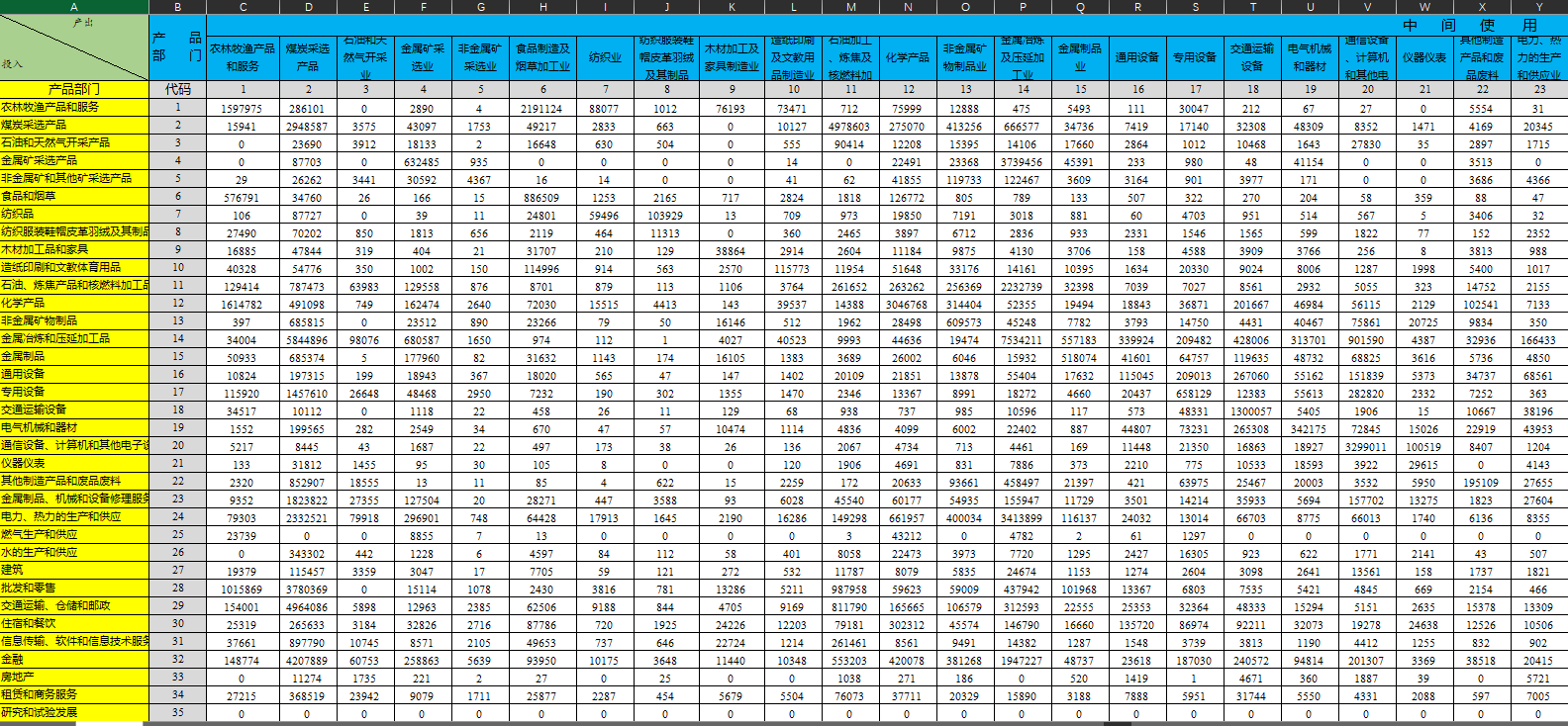 计算内容:直接消耗系数矩阵A=各部门投入/对应总投入