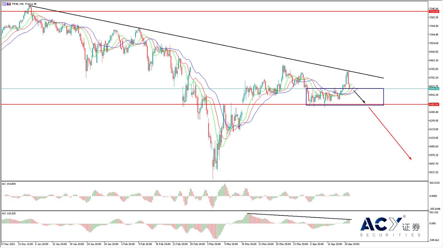 从法国指数四小时图来看,伴随鲍威尔讲话,指数同样吐出部分涨幅,回到下方的震荡箱体结构。短线形态呈现“破顶翻”,长线受到下降趋势线压制。指标方面,鳄鱼唇线触及到K线,有咬合的迹象;同时AC线下行接近零线,AO线变色高点下降。整体来看,空头力量虽然开始发力,但并没有扭转震荡局势。短线以突破做空为主,关注6600位置的实体突破行情,入场时机可以配合AC柱线下穿零线的空头信号。如果勒庞周日意外获胜,指数很可能获得大量空头卖压,导致价格下穿6450的短线支撑。同样配合消息面以短线突破做空为主。再下方的支撑要看6000的整数字元大关和5800前低点位置。