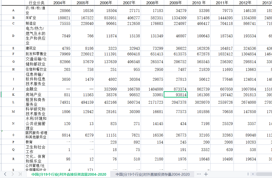 2.分19个行业对外直接投资存流量2004-2020:注:2004年、2005年金融业对外直接投资流量暂无统计。2004年、2005年金融业对外直接投资存量暂无统计。