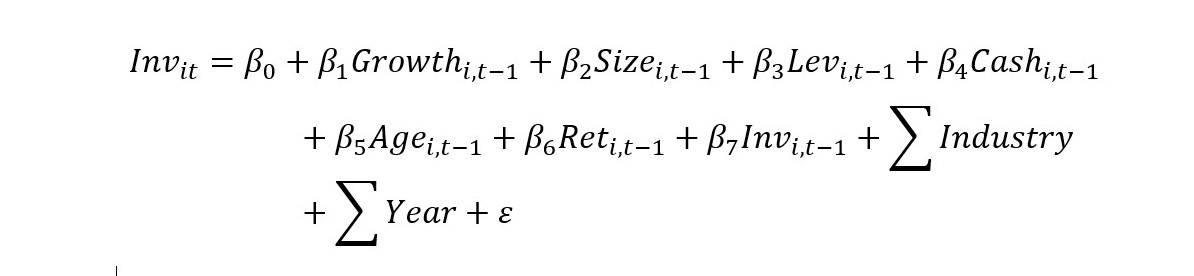 Inv it:t年资本投资支出,i公司 t 期的投资支出,具体定义为现金流量表中的构建固定资产、无形资产和其他长期资产所支付的现金 - 处置固定资产、无形资产和其他长期资产收回的现金净额 + 购买子公司及其他营业单位所支付的现金 - 处置子公司及其他营业单位所收到的现金,并用年初总资产进行标准化处理; Growth i,t-1:i公司t-1年的成长性;即托宾Q值 Size i,t-1:i公司t-1年的规模;公司年末总资产的自然对数 Lev i,t-1:i公司t-1 年的负债率,公司年末总负债除以年末总资产 Cash i,t-1:i公司t-1年的现金比;公司货币资金和短期投资之和除以年末总资产 Age i,t-1:i公司t-1年的上市年龄,当前年度减去公司的上市年度加上1的自然对数 Ret i,t-1:i公司t-1年的股票收益率; 考虑现金红利再投资年度回报率减去综合A股市场年度回报率(流通市值加权) INV i,t-1 :t-1年资本投资支出,i公司 t-1 期的投资支出 控制了年度( year) 和行业( industry) 因素。