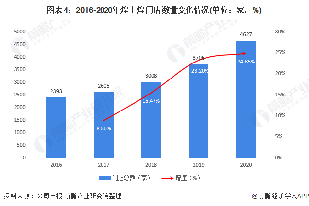 从门店数量上看,2016年以来,煌上煌门店数量逐年上升,扩张速度加快,截止到2020年底,煌上煌在全国共开设了4627家门店。