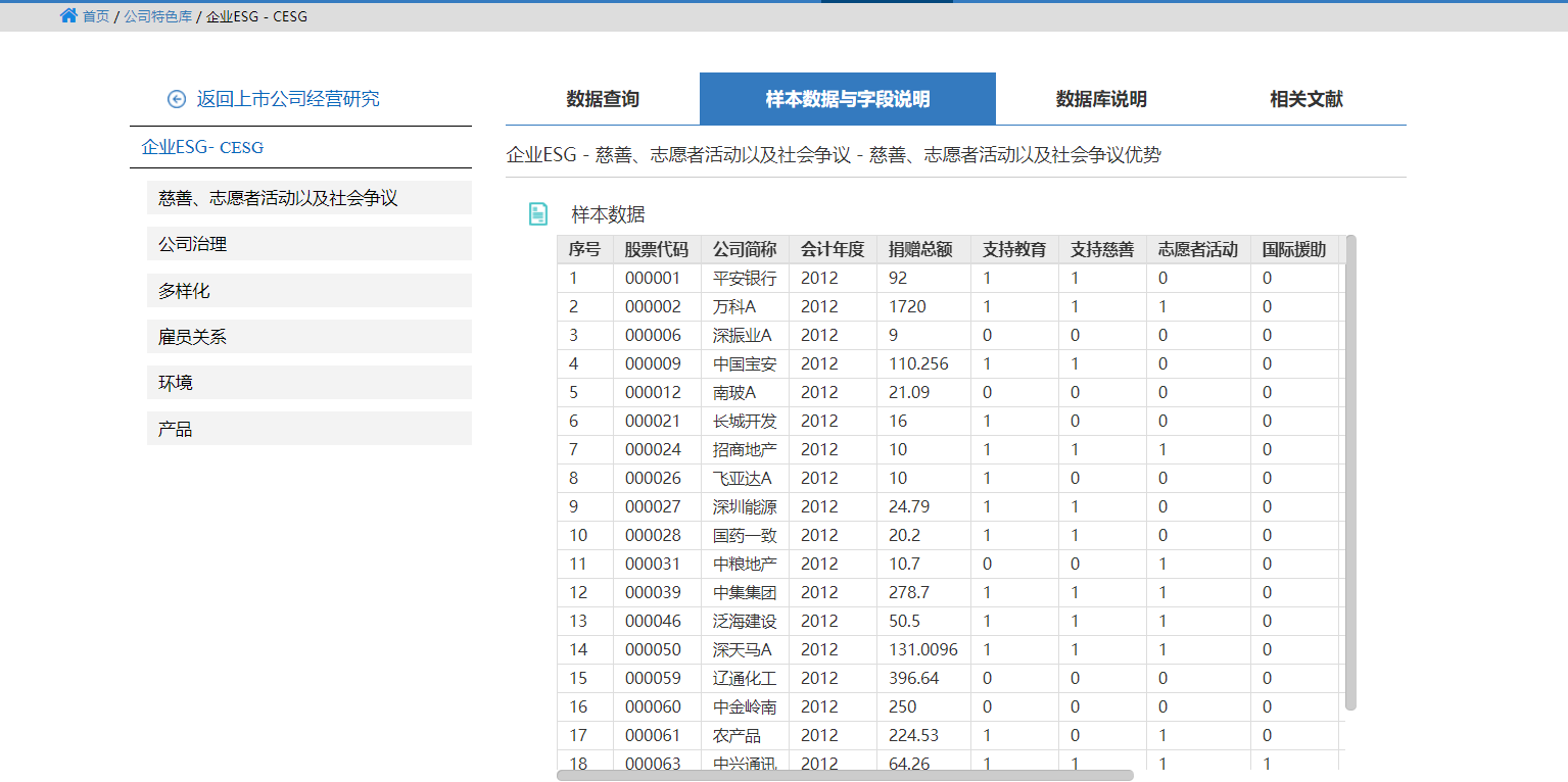 环境、社会和治理(ESG)近年来受到各方面的关注,ESG要求企业必须要超越把利润作为企业唯一目标的传统理念,强调在生产过程中对环境、对社会的贡献。企业落实社会责任,实现企业经济责任和社会责任的平衡,会提高企业的竞争力,为企业树立良好的声誉和形象,增强投资者信心。环境、社会和治理数据、(Environmental、Social and Governance Database of Listed Company,CESG)旨在为科研人员提供中国上市公司环境、社会和治理领域相关数据。CESG的设计参考了国内外知名ESG数据库的设计思路,从六个方面用58个细分指标对上市公司的环境、社会和治理情况进行衡量。