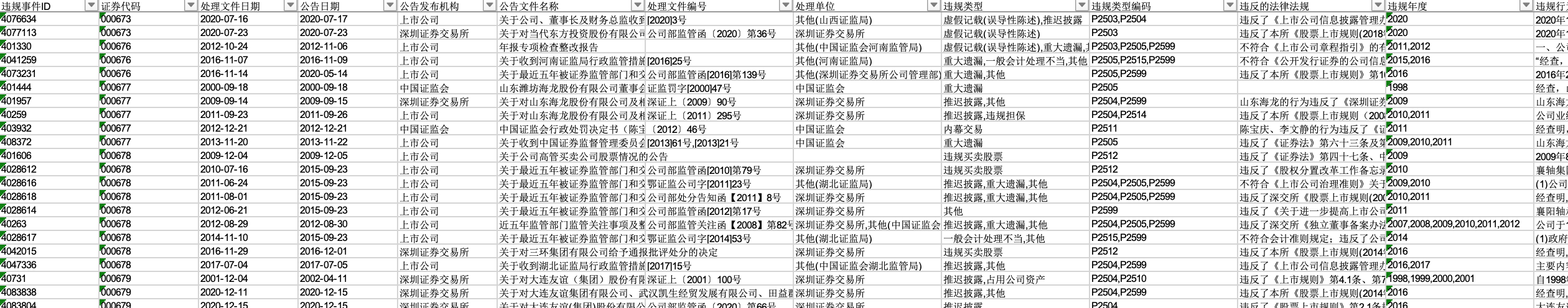 | 违规类型编码 | P2501=虚构利润;P2502=虚列资产;P2503=虚假记载(误导性陈述);P2504=推迟披露;P2505=重大遗漏;P2506=披露不实(其它);P2507=欺诈上市;P2508=出资违规;P2509=擅自改变资金用途;P2510=占用公司资产;P2511=内幕交易;P2512=违规买卖股票;P2513=操纵股价;P2514=违规担保;P2515=一般会计处理不当;P2599=其他