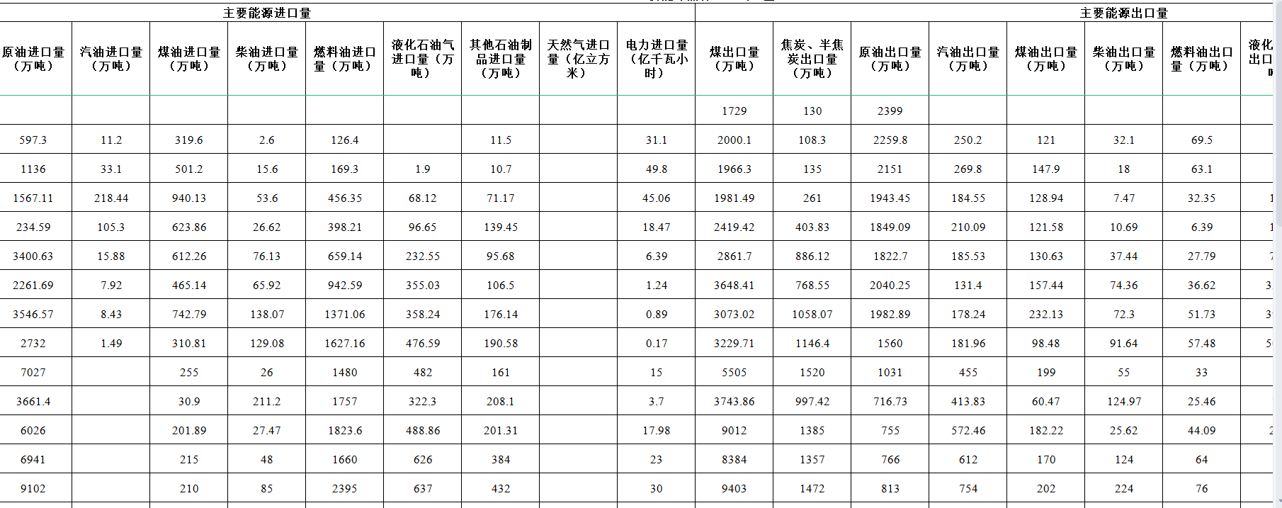 全国人均生活用能量(千克标准煤)、人均煤炭生活用量(千克)、人均电力生活用量(千瓦小时)、人均液化石油气生活用量(千克)、人均天燃气生活用量(立方米)、人均煤气生活用量(立方米)、城镇人均生活用能量(千克标准煤)、农村人均生活用能量(千克标准煤)、铁路机车(辆)、蒸汽机车(辆)、内燃机车(辆)、电力机车(辆)、铁路客车(辆)、铁路货车(辆)、民用汽车(万辆)、载客汽车(万辆)、载货汽车(万辆)、其他机动车(万辆)、公路部门营运车辆(万辆)、私人汽车(万辆)、民航飞机(架)、民用运输船舶(艘)、机动船(艘)、驳船(艘)、私人运输船舶(艘)、煤进口量(万吨)、焦炭进口量(万吨)、原油进口量(万吨)、汽油进口量(万吨)、煤油进口量(万吨)、柴油进口量(万吨)、燃料油进口量(万吨)、液化石油气进口量(万吨)、其他石油制品进口量(万吨)、天然气进口量(亿立方米)、电力进口量(亿千瓦小时)、煤出口量(万吨)、焦炭、半焦炭出口量(万吨)、原油出口量(万吨)、汽油出口量(万吨)、煤油出口量(万吨)、柴油出口量(万吨)、燃料油出口量(万吨)、液化石油气出口量(万吨)、其他石油制品出口量(万吨)、天然气出口量(亿立方米)、电力出口量(亿千瓦小时)、钢材进口量(万吨)、钢铁丝进口量(吨)、未锻造的铜及铜合金进口量(万吨)、未锻造的铝及铝合金进口量(万吨)、锌及锌合金进口量(吨)、烧碱进口量(吨)、纯碱进口量(万吨)、肥料进口量(万吨)、纸浆进口量(万吨)、纺织用合成纤维进口量(万吨)、水泥出口量(万吨)、平板玻璃出口量(万平方米)、钢材出口量(万吨)、钢铁丝出口量(吨)、铜材出口量(吨)、铝材出口量(万吨)、未锻造的锌及锌合金出口量(吨)、纸及纸板(未切成形)出口量(万吨)