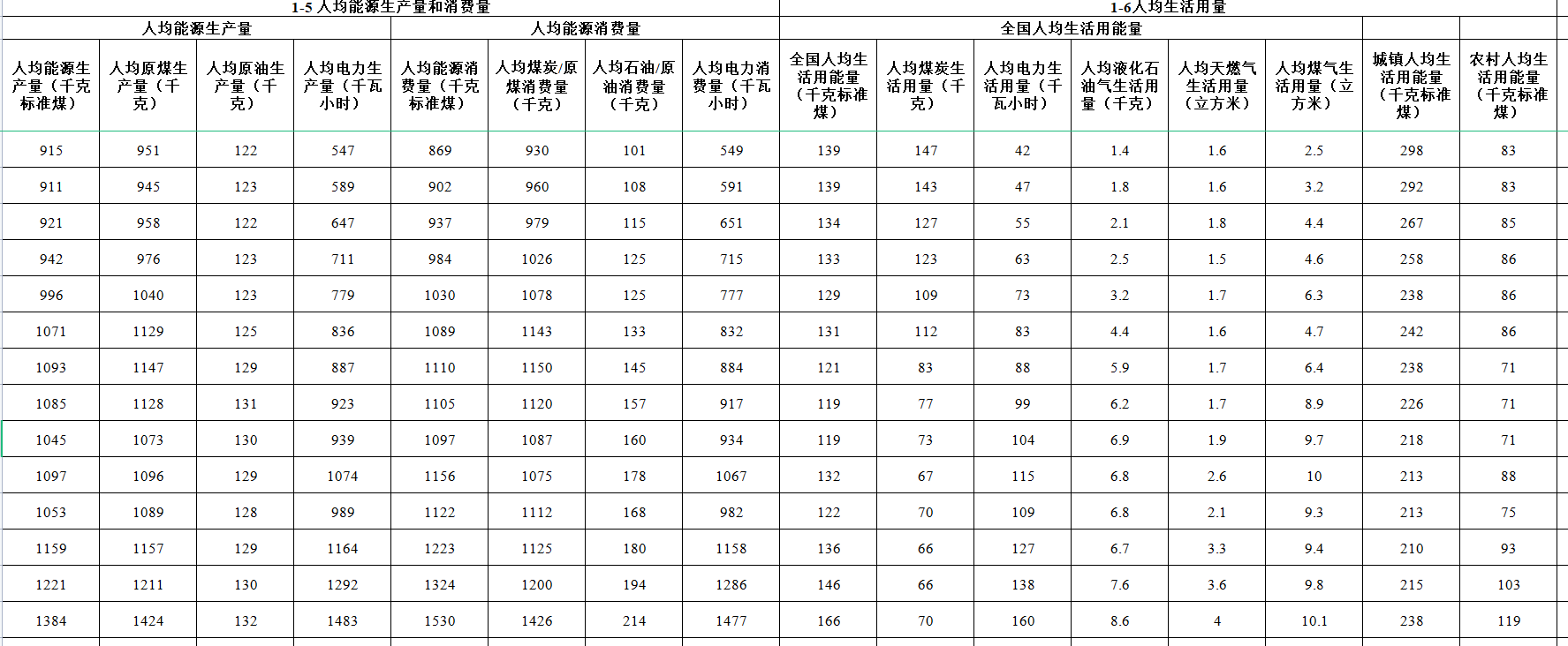 人均能源消费量:人均能源消费量(千克标准煤)、人均煤炭/原煤消费量(千克)、人均石油/原油消费量(千克)、人均电力消费量(千瓦小时)