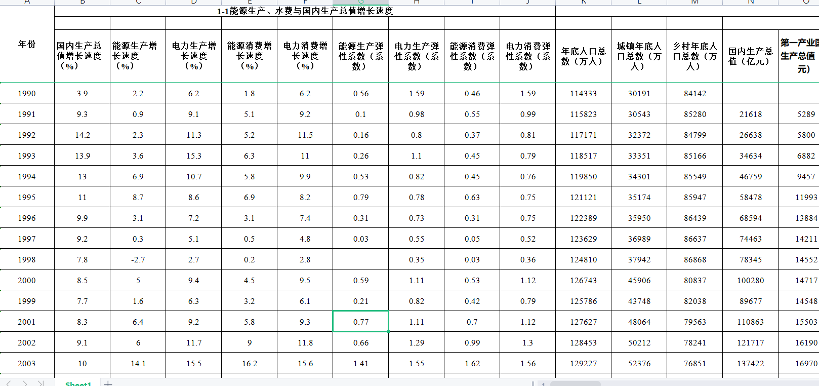 1-1能源生产、水费与国内生产总值增长速度:国内生产总值增长速度(%)、能源生产增长速度(%)、电力生产增长速度(%)、能源消费增长速度(%)、电力消费增长速度(%)、能源生产弹性系数(系数)、电力生产弹性系数(系数)、能源消费弹性系数(系数)、电力消费弹性系数(系数)