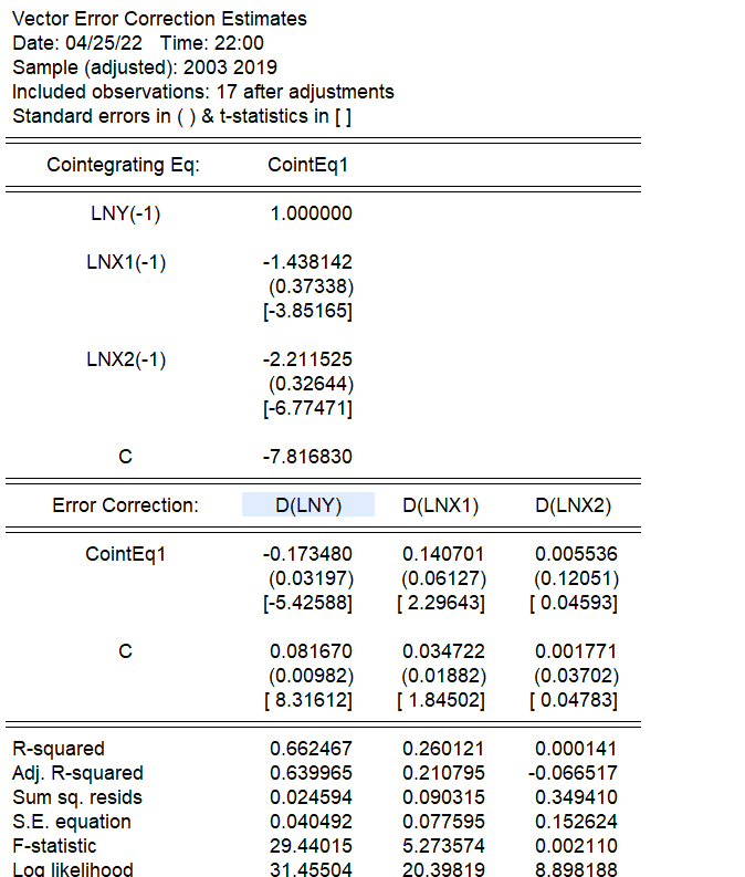 LNY是人均GDP取对数,LNX1是银行业规模(存贷款总额/GDP),LNX2是银行业效率(存款/贷款),恳请大佬帮我解释解释这个误差修正模型