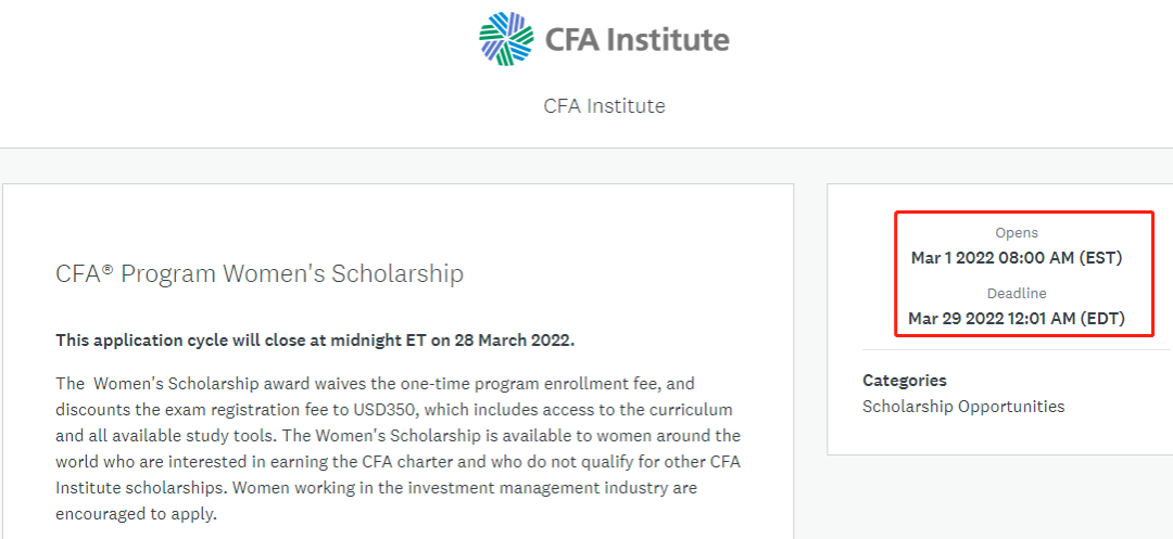 2022年CFA考试女性奖学金:申请入口于3月1日上午8:00开放,将在3月28日美国东部时间午夜结束。 ▼▼▼