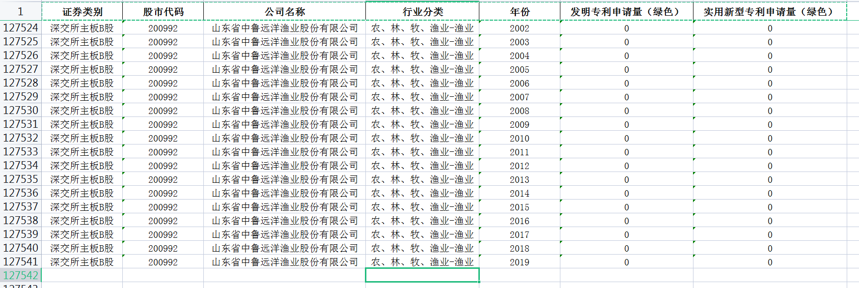 数据指标:证券类别、股市代码、公司名称、行业分类、年份、发明专利申请量(绿色)、实用新型专利申请量(绿色)
