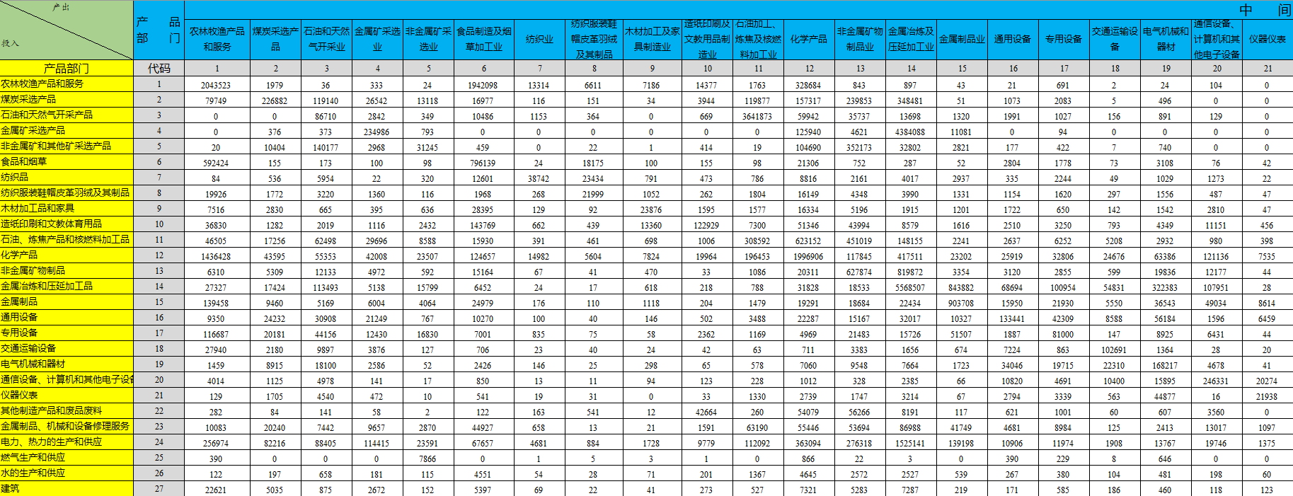 计算内容:直接消耗系数矩阵A=各部门投入/对应总投入