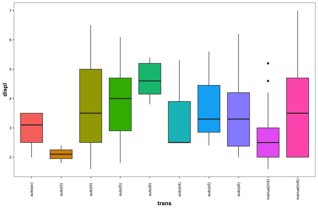 ggplot(mpg,aes(x=trans,y=displ,fill=trans))+theme_bw()