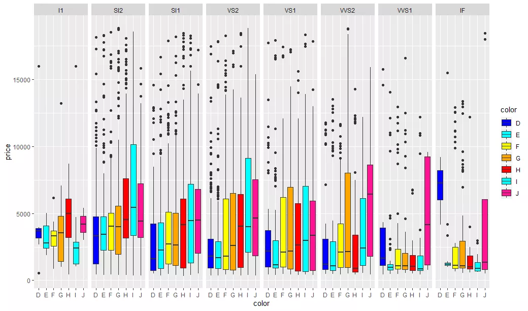 ggplot(dsmall,aes(x=color,y=price,fill=color))+