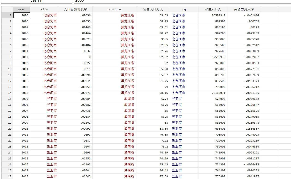利用常住人口和人口自然增长率计算各地级市的劳动力流动情况,基于各市常住人口数据估算劳动力净流入率(林理升和王晔倩, 2006) ,并假定流动人口中的90%是适龄劳动力(段平忠,2013)其中,部分地级市的常住人口缺失,参考郝凤霞等(2021)使用地级市GDP/人均GDP求得,对缺失值进行补充。
