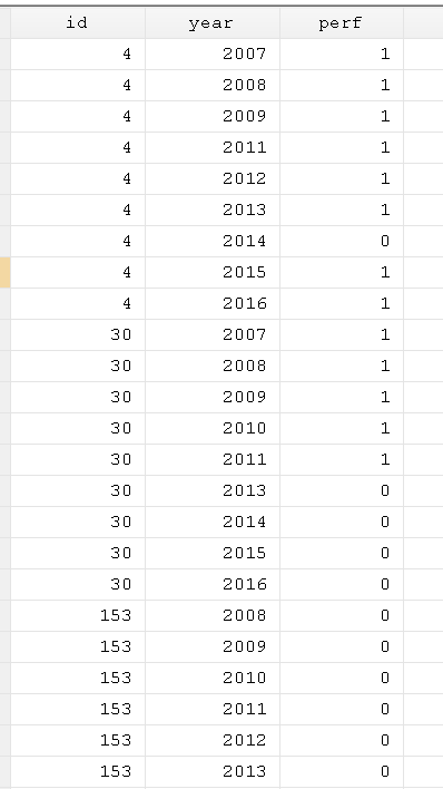 如上,变量perf为虚拟变量,现在要重新定义一个变量perf_dur,若perf持续1年为1,则perf_dur编码为1,;若perf持续2年为1,则perf_dur编码为2;若perf持续3年为1,则perf_dur编码为3,以此类推。请问该怎么写代码?求知道的老师和同学解答疑惑
