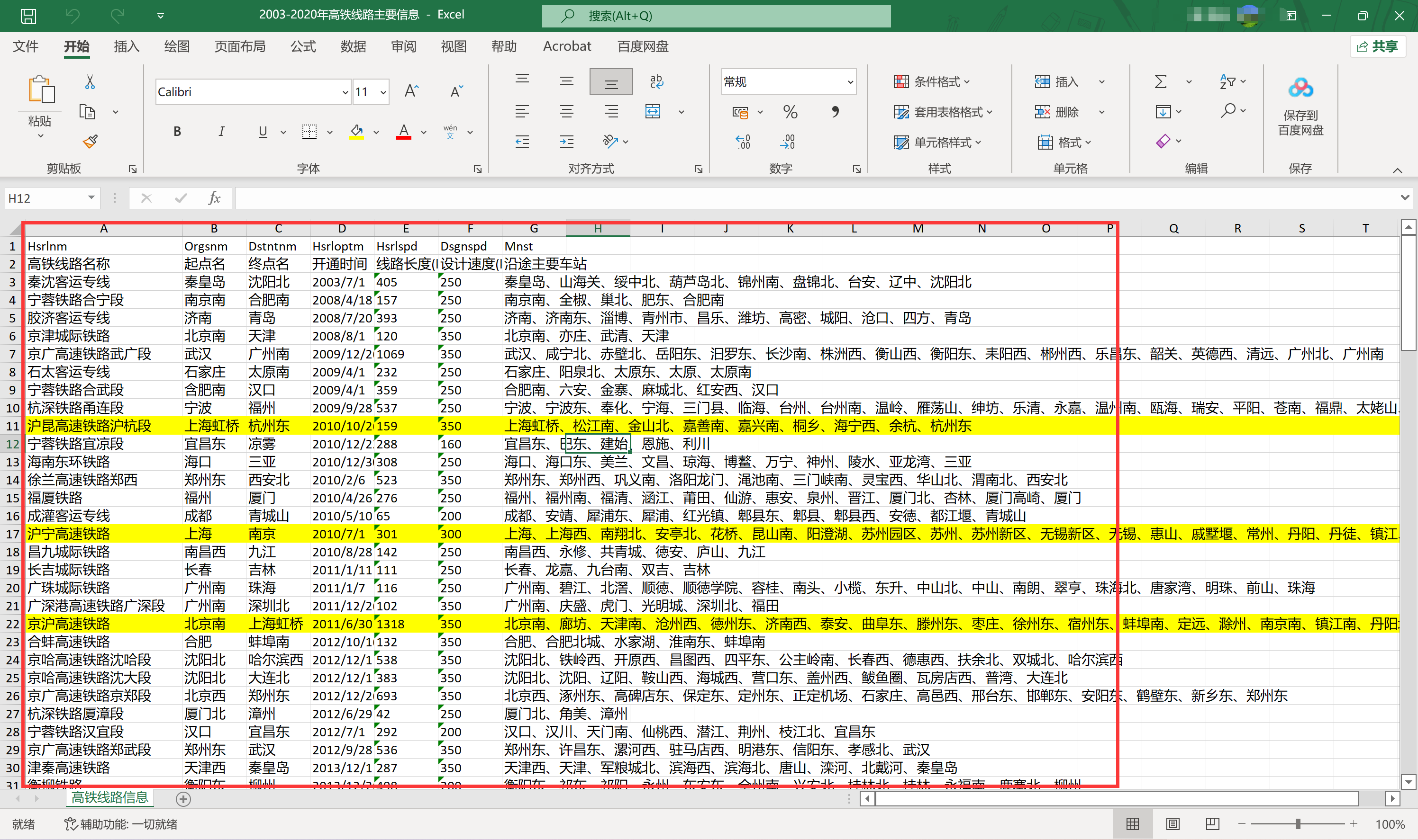 最新·2003-2020年全国高铁线路、列车和开通时间面板数据(常用学术研究)