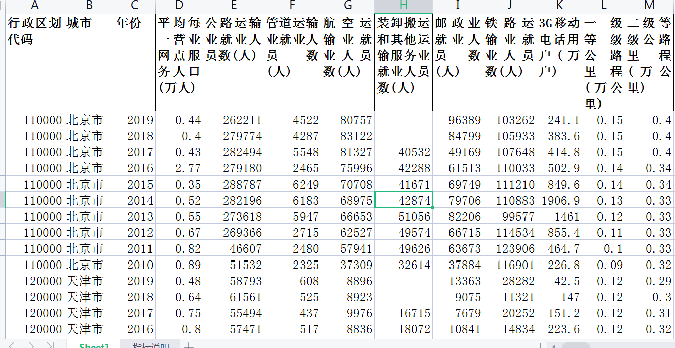 部分数据指标:变量、行政区划代码、城市、年份、公路运输业就业人员数(人)、城市公共交通业就业人员数(人)、平均每一营业网点服务人口(万人)、水上运输业就业人员数(人)、电信和其他信息传输服务业就业人员数(人)、管道运输业就业人员数(人)、航空运输业就业人员数(人)、装卸搬运和其他运输服务业就业人员数(人)、邮政业就业人员数(人)、铁路运输业就业人员数(人)、一级等级公路里程(万公里)、二级等级公路里程(万公里)、互联网上网人数(万人)、互联网宽带接入用户(万户)、互联网宽带接入端口(万个)、互联网拨号用户(万户)、互联网普及率(%)、铁路客运量(万人)、铁路旅客周转量(亿人公里)、铁路营业里程(万公里)、铁路货物周转量(亿吨公里)、铁路货运量(万吨)、铁路邮路总长度(公里)、长途光缆线路长度(万公里)、集邮业务量(万枚)、高速等级公路里程(万公里)等等
