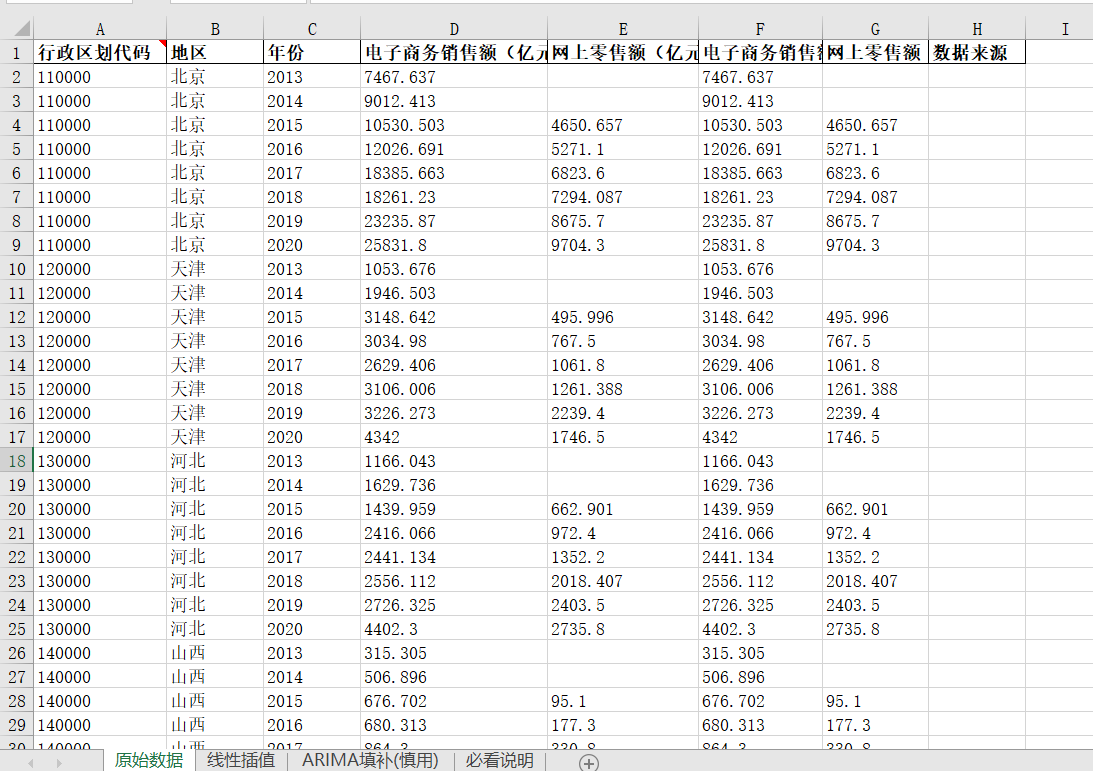 数据整理:内含原始版本、线性插值版本、ARIMA填补版,