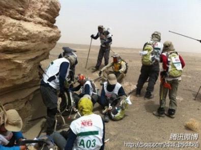 尽管做了充分的准备,恶劣的天气,崎岖的路程还是带来了意外。刚开始不久,在拉练中被队员誉为“最麻辣”的A对罗全队友,不慎旧伤复发,但是他还是一直坚持在这样的飞沙走石中,艰难地走完了近30公里的全程。晚上,回到营地的医务室,医生很严肃地说:“不行,你不能再坚持了,你的脚骨骨裂!如果再走下去,就要废掉了。”这对罗全及新国大所有的队员来说,都是最痛心的,大家决定,让罗全退出比赛,队友曹轶也退出比赛,陪同他立刻返程去接受治疗。罗全失声痛哭,李强队长和队员也忍不住相拥而泣,然后目送罗全走上返程的道路。但是大家相信,虽然罗全的身影已经离开了戈壁,但是他的心会和大家在一起,继续后面三天的征程。