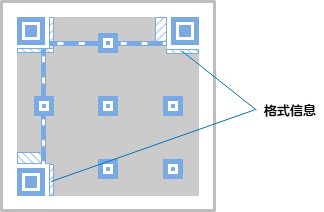 - 格式信息:表示该二维码的纠错级别,级别越高,纠错能力越强。例如,需要编码的码字数据有100个,并且想对其中的一半,即对50个码字进行纠错,则计算方法如下。纠错需要相当于码字2倍的符号(RS编码※),因此在这种情况下的数量为50个×2=100码字。因此,全部码字数量为200个,其中用作纠错的码字为50个,所以计算得出,相对于全部码字的纠错率就是25%。这一比率相当于QR码纠错级别中的“Q”级别。Level L:最多7% 的字码可被修正。Level M:最多15% 的字码可被修正。Level Q:最多25% 的字码可被修正。Level H:最多30% 的字码可被修正。