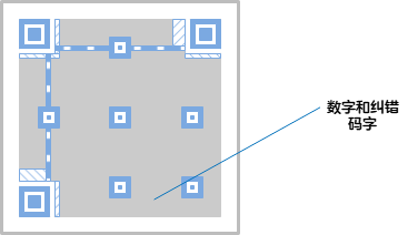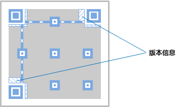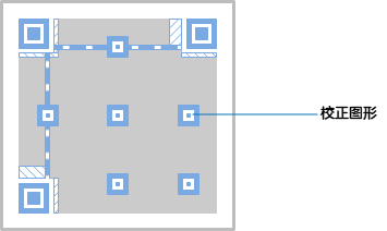 - 校正图形:在图像有一定程度损坏的情况下,译码软件可以通过它同步图像模块的坐标映像。不同规格的二维码校正图形的数量和位置是不一样。规格确定,它的数量和位置也就确定了。