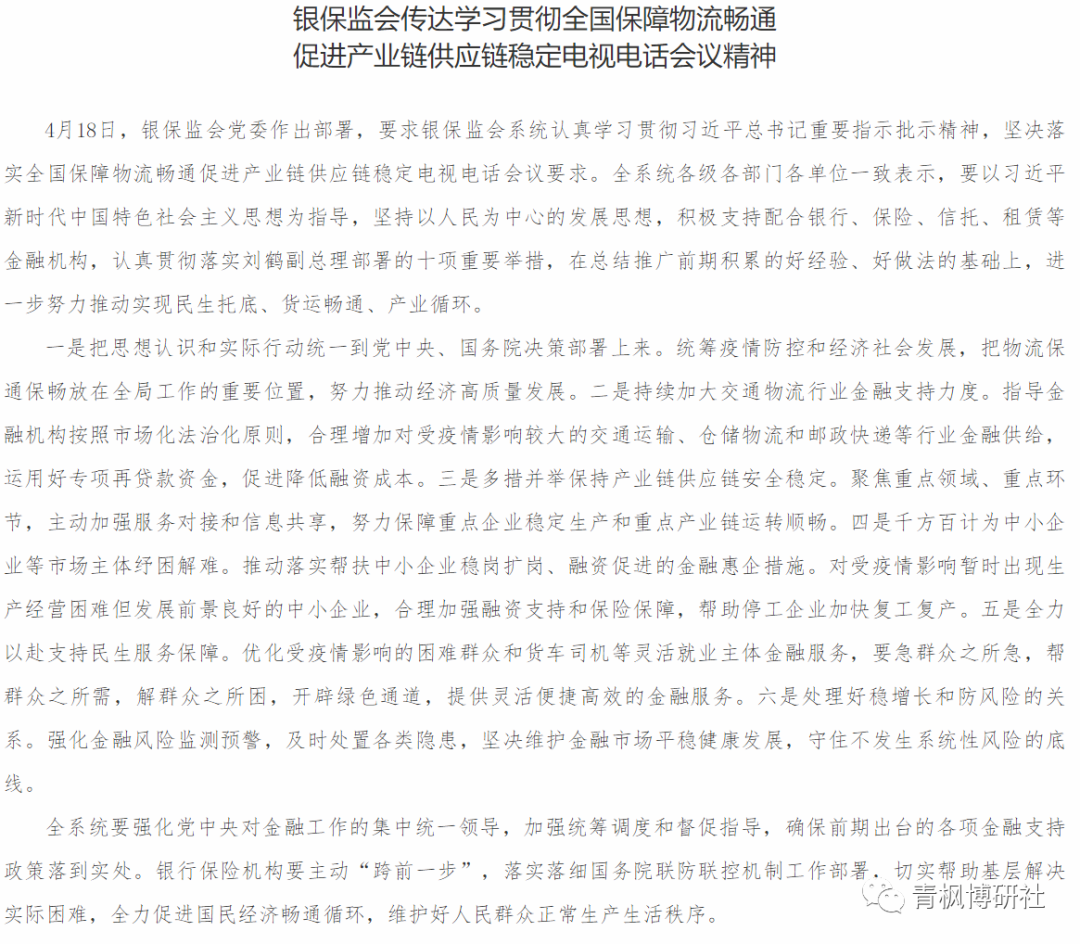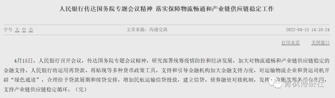 一、央行与银保监会传达会议精神:落实保障物流畅通和产业链供应链稳定工作(一)2022年4月15日,央行召开会议,传达国务院专题会议精神,进一步落实保障物流畅通和产业链供应链稳定工作,明确将运用再贷款、再贴现等多种货币政策工具,通过合理给予贷款展期和续贷安排,建立信贷和债券融资对接机制,支持和引导金融机构加大对运输物流企业和货运司机的金融支持力度,增加民航运输信贷投放。可以看出,此次会议的针对性较强,重在运输物流行业。