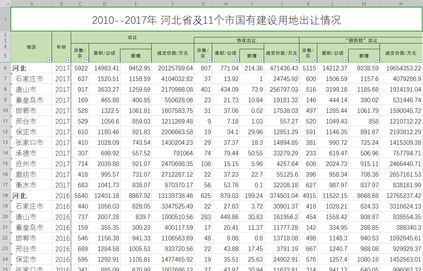 内容为河北省及 石家庄市、唐山市、秦皇岛市、邯郸市、邢台市、保定市、张家口市、承德市、沧州市、廊坊市、衡水市11个市国有建设用地出让情况,内容包含2010--2017年8个年度的【协议出让:宗数、面积、成交价款;“招拍挂”出让:宗数、面积、成交价款;以及总的出让:宗数、面积、成交价款】对于研究各个地市的土地出让数量、土地出让面积、土地出让金额等会有较大的帮助。