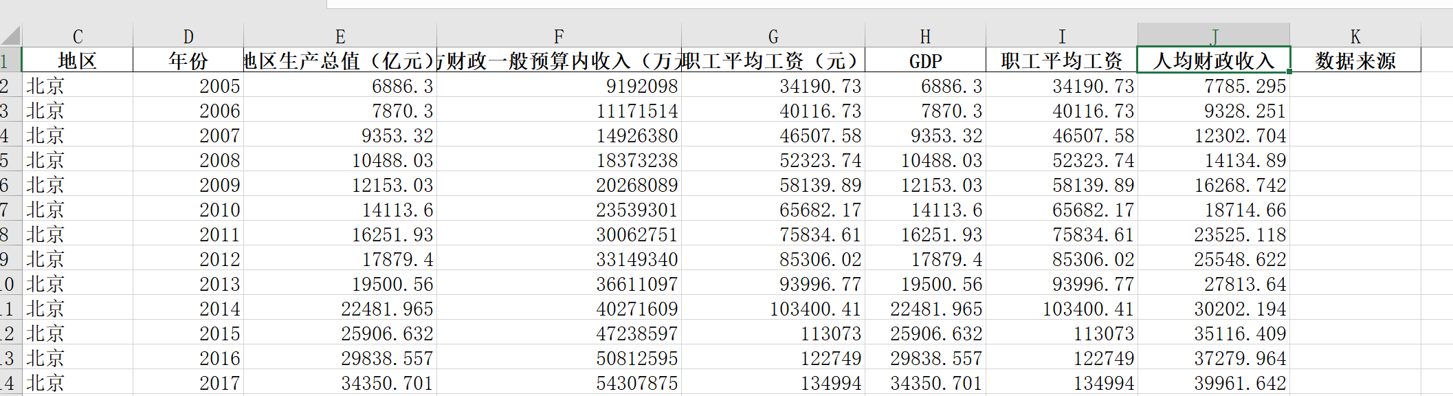 地级市地区生产总值(亿元)、地方财政一般预算内收入(万元)、职工平均工资(元)、人均财政收入2005-2019