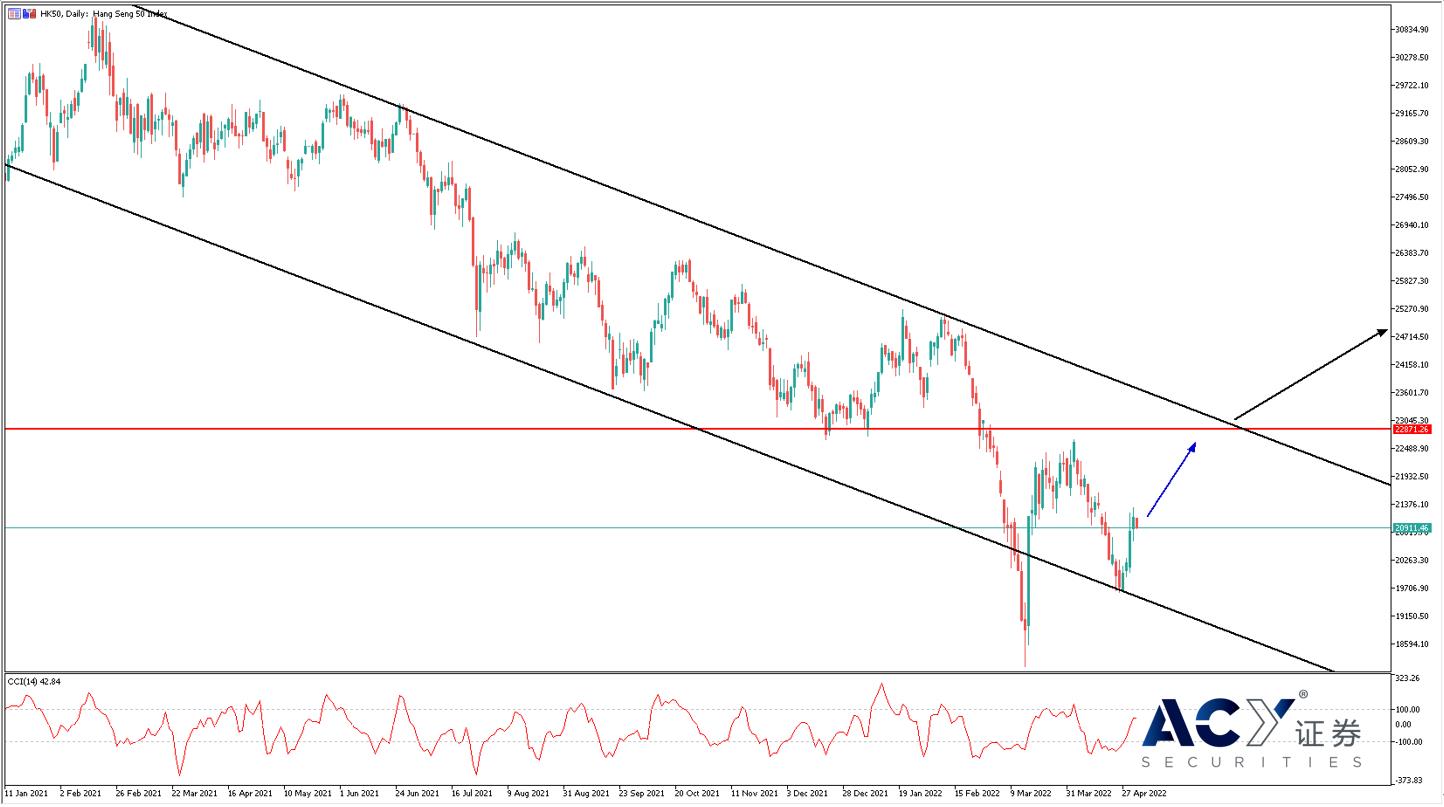 从恒生指数日线图来看,自去年2月份开始,指数便呈现单向下滑,下降信道结构完整。现价21000位置恰好是疫情期间的最低点,可见从估值的角度来看,恒生指数远不及他国指数。因此当美联储开始加息,游资很可能将从欧美股市流向恒生指数。此外,恒指中的成分股大头主要是银行与互联网企业,近期国内的封锁反而恢复了在线服务行业的需求(如外卖、购物、游戏等)。整体来看,短线与中线均有基本面利好支撑,交易策略可以采用突破做多。今晚关注21200-21300的实体突破机会,配合小时级别的CCI趋势指标上穿+100线的多头信号,可以有效提高入场胜率。中长线投资者则需要等待价格上穿趋势线与颈线的共同结构23000大关。