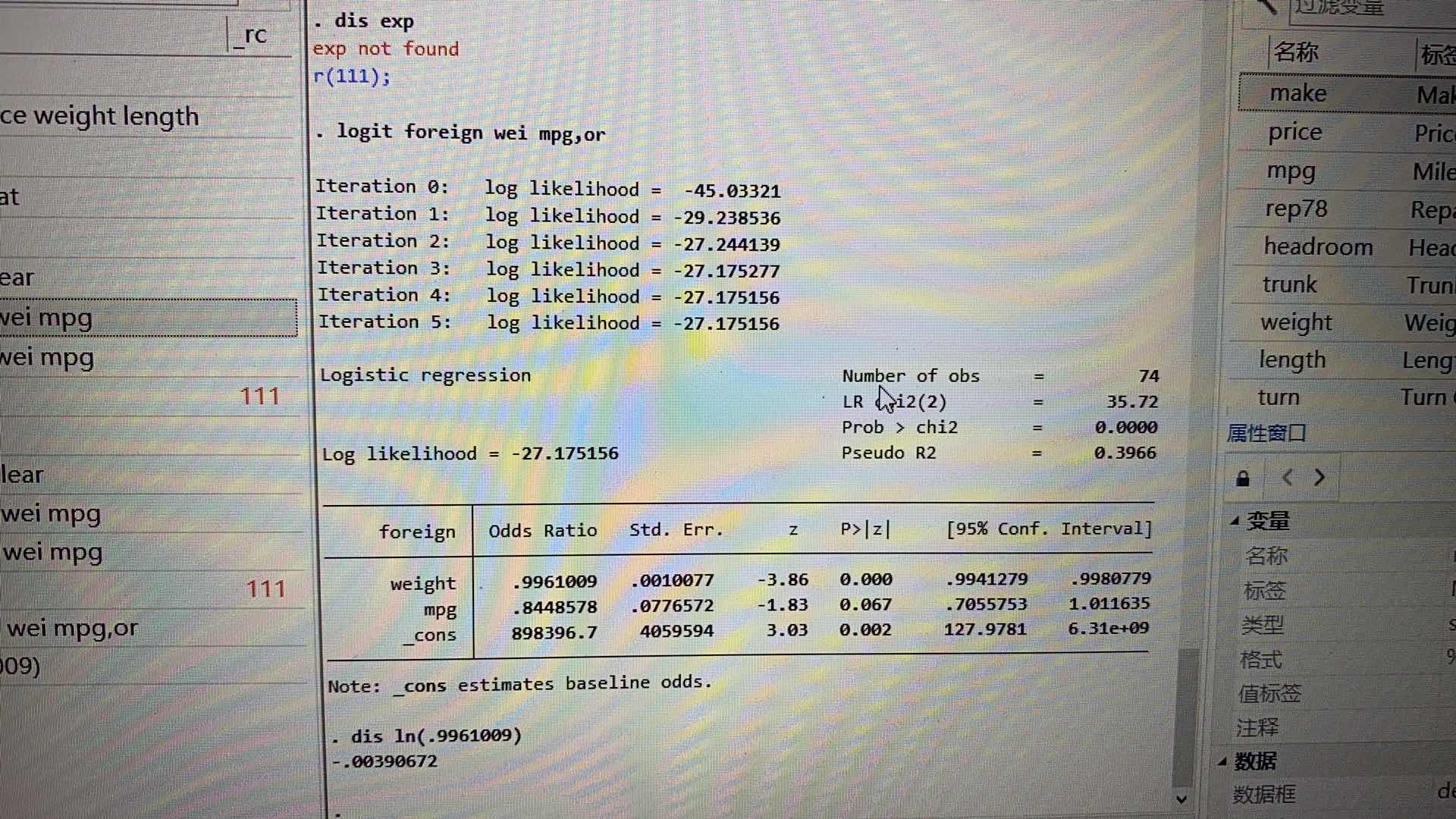系数就是,mpg改变1个单位时,foreign是外国和国内概率比的对数变化值。一般系数比较难解释,所以用OR居多。也就mpg改变1个单位时,logit foreign%的改变量。
