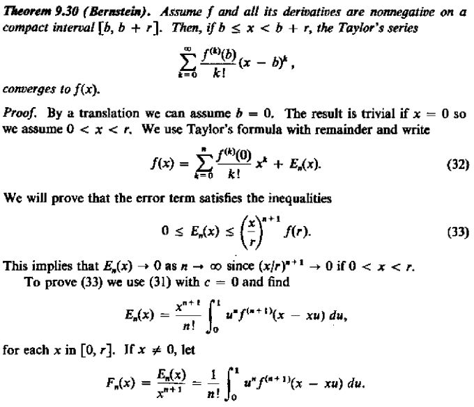 一个在[a,b]上无穷次可导的函数f,[a,b]内任意点的任意阶导数存在且非负,求证f在[a,b]内的泰勒级数收敛于它本身!