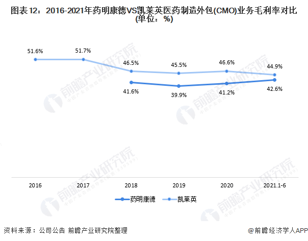 从医药制造外包(CMO)业务毛利率水平来看,凯莱英毛利率水平较高,说明其获利能力较强;2016-2020年均在45-52%之间,但药明康德与凯莱英的毛利率水平差距较小,2021年上半年差距仅为2.3%。