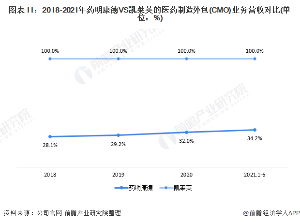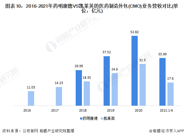 从医药制造外包(CMO)业务整体营收水平上看,药明康德的医药制造外包(CMO)业务营收近年来都远远超过了凯莱英,并且呈现不断攀升态势;从2018年的26.99亿元上升至2020年的52.82亿元;2021年上半年,药明康德的医药制造外包(CMO)业务收入达到了35.99亿元。凯莱英的医药制造外包(CMO)业务收入也呈现不断攀升的态势,从2016年的11.03亿元上升至2020年的31.5亿元;2021年上半年,凯莱英的医药制造外包(CMO)业务收入达到了17.6亿元。