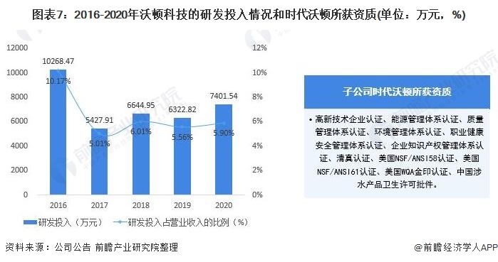 沃顿科技是国内技术领先、国际先进的复合反渗透膜专业化、规模化生产企业,拥有一支多年从事膜材料基础工艺过程研究、水处理系统方案设计并在水处理行业具有丰富经验的专家队伍,其研发投入也相对稳定,2016-2020年,沃顿科技的研发投入占营业收入的比例在5%以上。