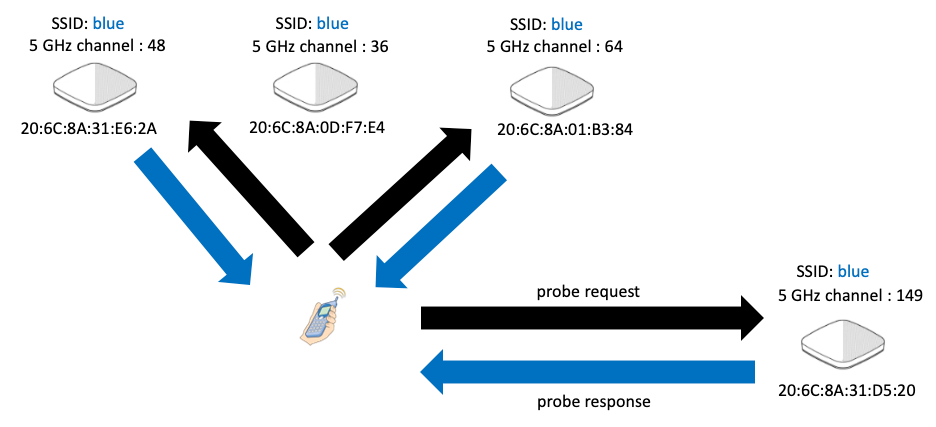 设备在接入AP后,该AP会将其附近AP的BSSID和频道信息发送给用户。这样一来,用户在需要切换到另一个AP时,就不用再扫描一遍频道了。这样做的好处,一来是极大节省了切换时间,保证通信不出现中断。二来是给用户设备省电,设备不再需要发送一个个探针。第三,就是无线信道也得到了更加有效的利用,AP不需要频繁占用无线信道来不断回应终端的请求。