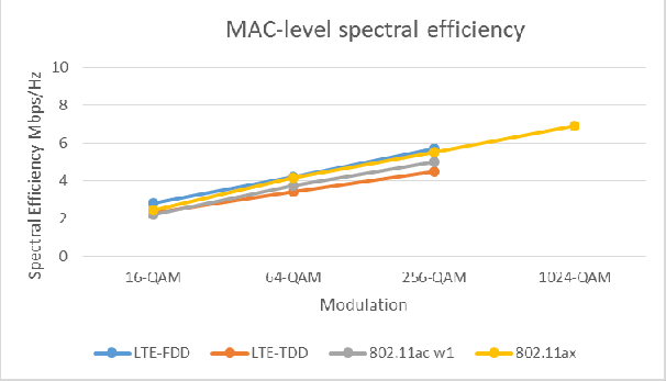 两种方案都能让信道得到充分的利用。参考Aruba Networks发布的测试结果可以看出,LTE和Wi-Fi 6在MAC层面的频谱使用效率非常接近,单流、256QAM的情况下,都能到5bps/Hz以上的频谱使用效率。