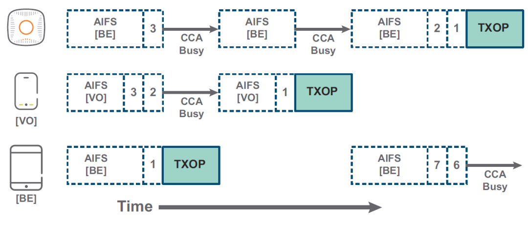 Wi-Fi将数据分为四种不同的优先级,从上到下分别为语音(VO),视频(VI),最大努力(BE)和背景(BK)。每一个级别,都会附上不同的AIFS值。AIFS值越低,发送优先级越高。