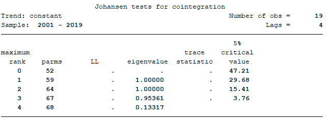 想问一下各位大佬,我的协整检验为什么会出现0值