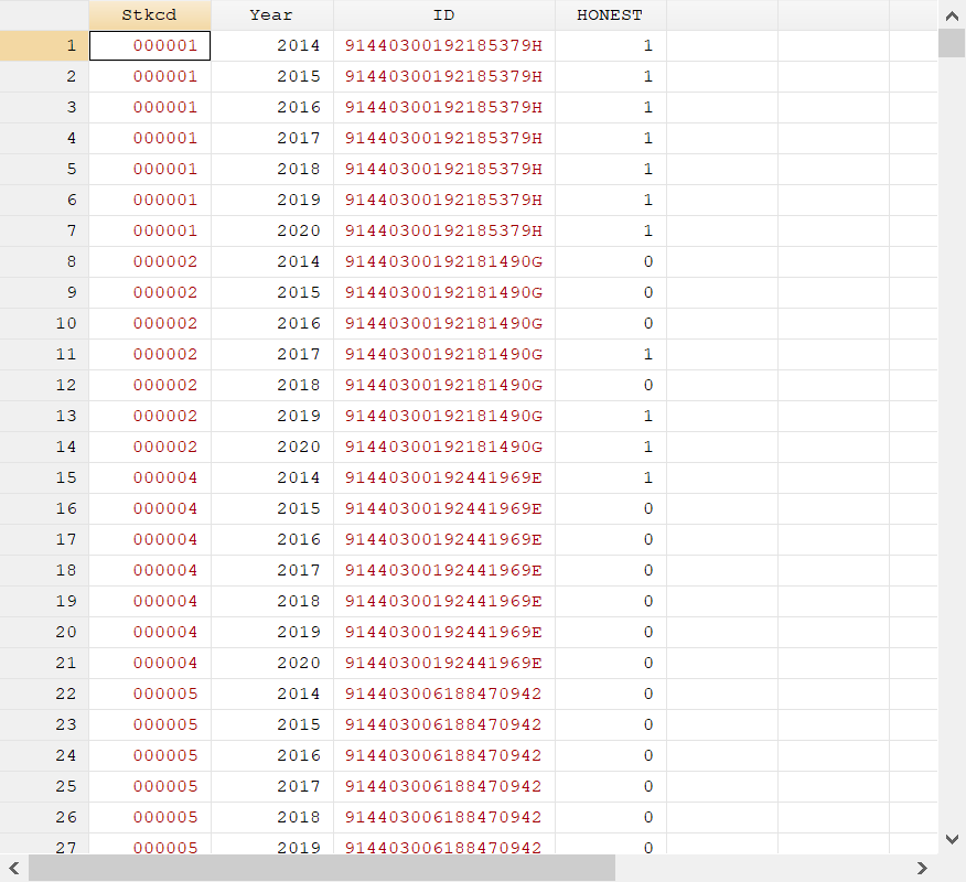 纳税诚信的面板数据,HONEST为虚拟变量,评级为A赋值1,非A赋值0。想要根据评级结果将样本分类,共分为四类:上年度与当年均为A、均为非A、上年为非A当年为A、上年为A当年为非A,分别构造虚拟变量SAME_G、SAME_B、BETTER、WORSE。不知道如何用stata命令实现,是需要使用循环语句还是其他?望大神赐教