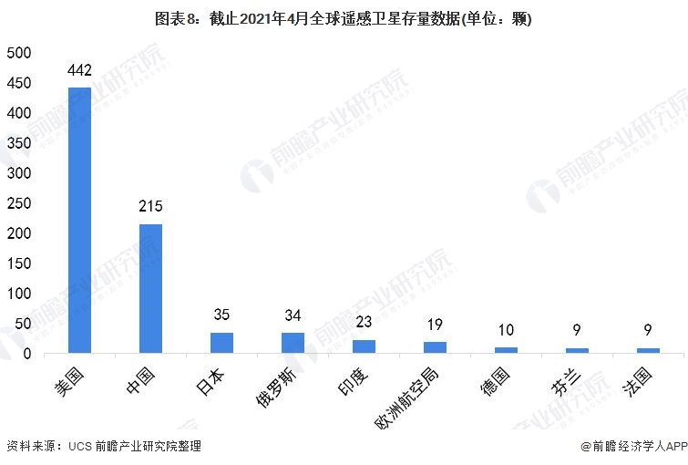 从各国(地区)拥有卫星数量角度来看,截止到2021年4月,美国拥有的遥感卫星存量排名第一,数量为442颗;其次为中国,遥感卫星存量215颗;第三为日本,数量为35颗;俄罗斯、印度、欧洲航空局遥感卫星存量在15颗以上。美国和中国遥感卫星存量相比其他国家处于绝对优势地位,但美国遥感卫星存量在中国的两倍以上,中美遥感卫星存量差距依旧明显。