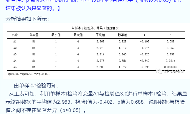 单样本T检验的原假设为样本均值与给定常值相等,若P<0.05,则拒绝原假设H0,接受H1,认为所考察的单个变量样本均值在95%的置信水平下与给定常值不等,其之间差异具有统计学意义或具有显著性差异。