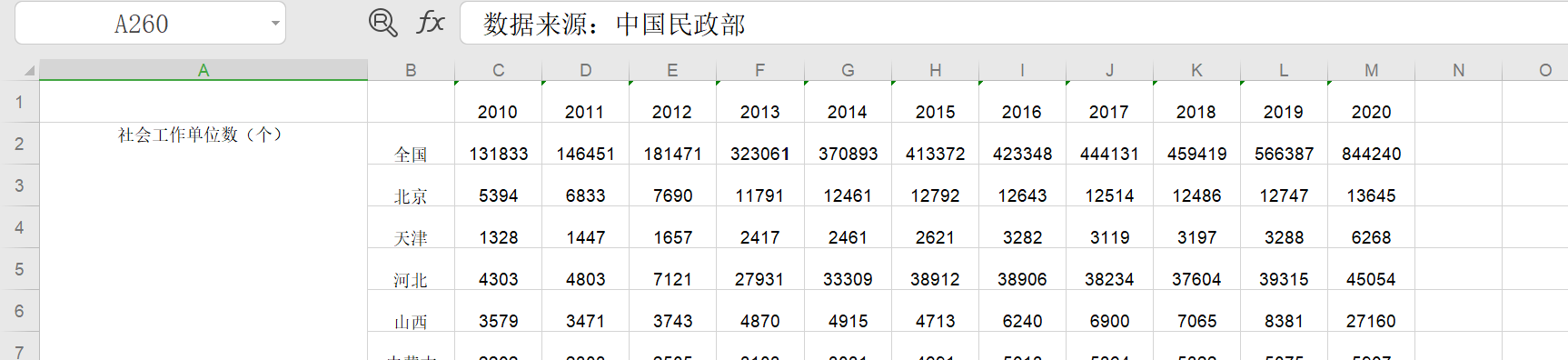 指标包括:社会工作单位数(个)、社会工作单位年末职工人数(人)、社会工作单位职工大学专科人数(人)、社会工作单位职工大学本科及以上人数(人)、社会工作单位助理社会工作师人数(人)、社会工作单位社会工作师人数(人)、志愿者服务人次数(人次)、志愿服务时间(时)
