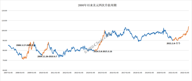 Choice数据显示,2000年以来美元经历了四次明显的升值周期。分别是2008年3月17日-2009年3月4日,2009年11月26日-2010年6月7日,2014年5月8日-2015年3月16日,2021年1月6日-至今。