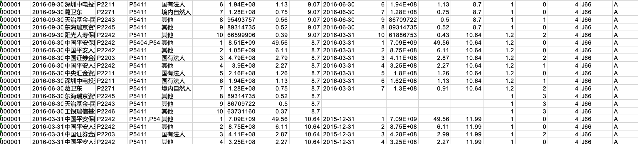 CategoryCode [股东类别编码] - P2201:合格境外投资机构;P2202:银行;P2203:证券公司;P2204:基金公司;P2205:保险公司;P2206:财务公司;P2207:期货公司;P2208:信托公司;P2209:金融资产管理公司;P2210:证券投资咨询公司;P2211:风险投资公司;P2212:ZF机构/事业单位;P2213:其他境外机构;P2214:上市公司;P2239:其他机构;P2241:证券投资基金;P2242:保险投资组合;P2243:基金专户理财;P2244:社保基金;P2245:券商集合理财;P2246:信托