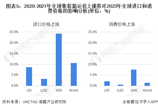 根据联合国贸易与发展会议(UNCTAD)的数据,基于近期的全球集装箱运费上涨,预计到2023年,全球进口价格水平将平均上涨11%,全球消费市场整体价格也将比没有运价飙升的情况下高出1.5%;并且对于严重依赖进口商品满足其消费需求的较小经济体来说,这一影响将更为严重,预计到2023年,小岛屿发展中国家的进口价格将上涨24%左右,消费价格将上涨7.5%。