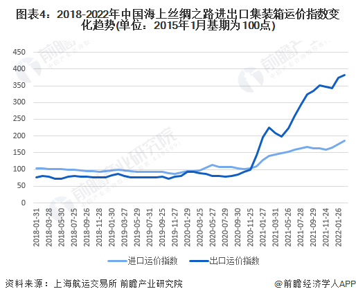 全球集装箱运输市场供不应求的状况也导致集装箱运价快速持续上涨。参考上海航运交易所发布的中国海上丝绸之路集装箱进出口运价指数变化趋势,自2020年下半年以来,集装箱进出口运费持续上涨,截至2022年初,上涨势头仍然在持续。主要是由于全球集装箱运输能力受到物流障碍以及集装箱运力短缺的制约,另外船期不可靠和港口拥堵等因素也导致各种附加费用飙升。